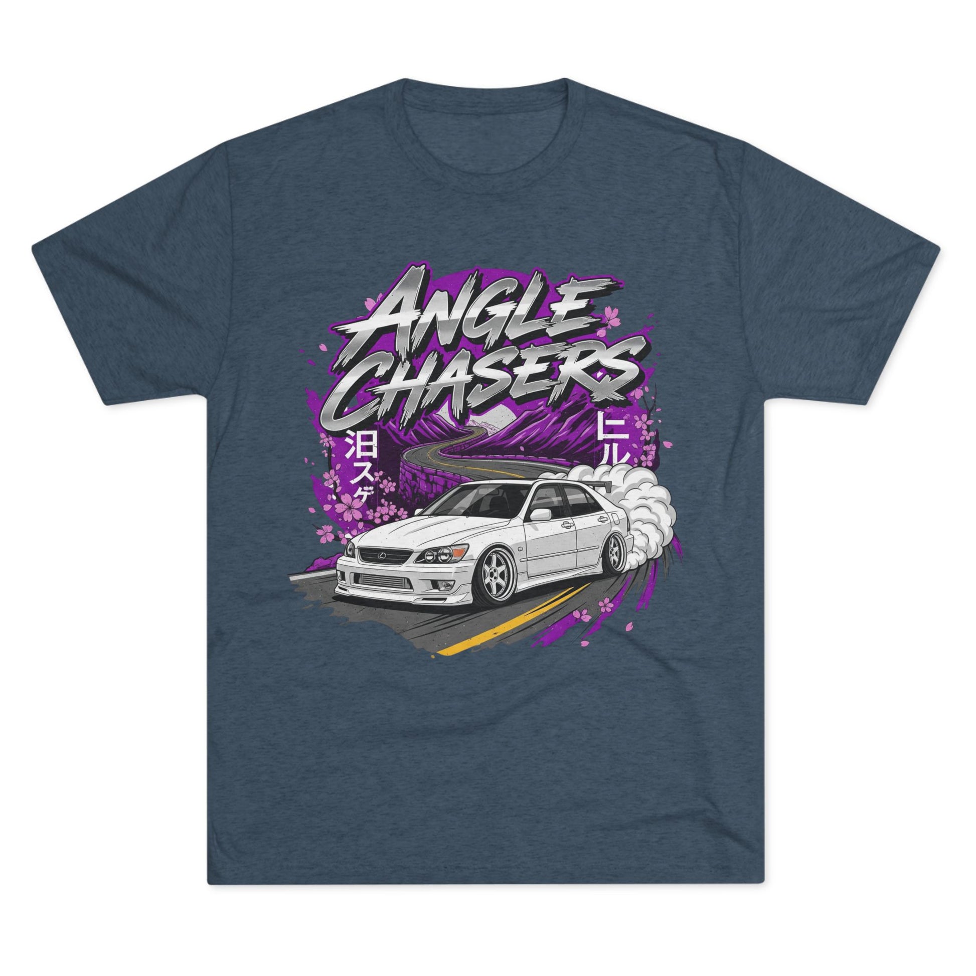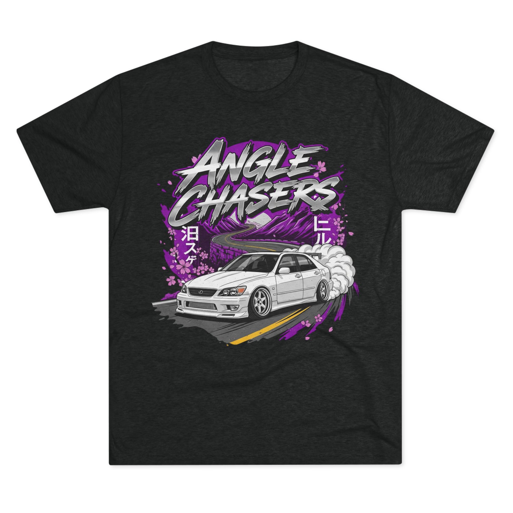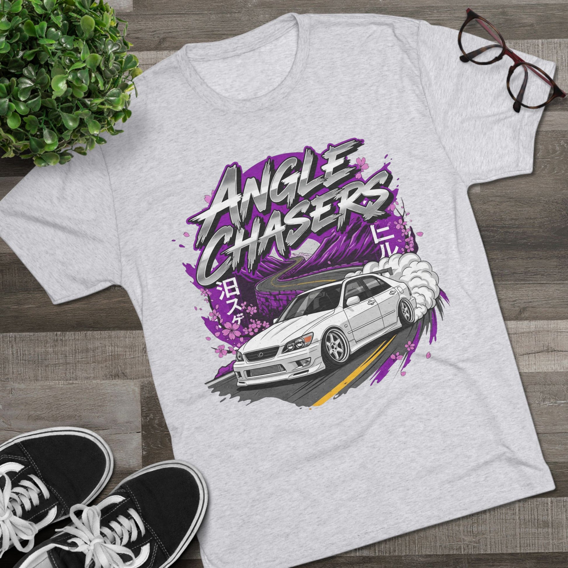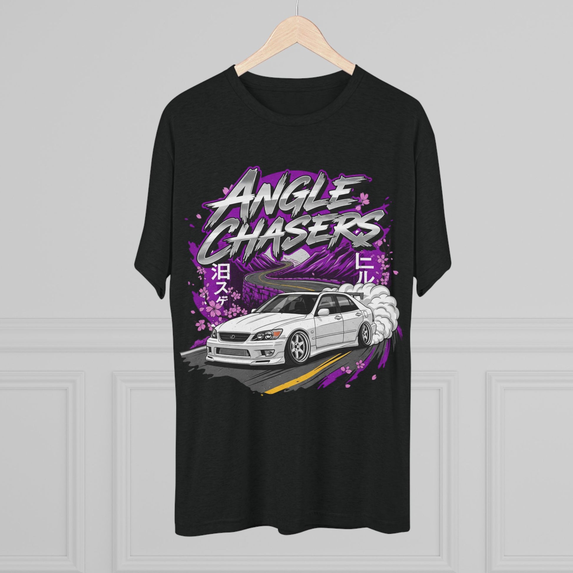 A soft and durable tri-blend crew tee with a stylish IS300 mountain drifting, giving off a cool and casual vibe. Featuring Angle Chasers sponsor logos on the back. Perfect for enthusiasts of drifting and car culture. Ideal for gifting during birthdays, holidays, or car meets.