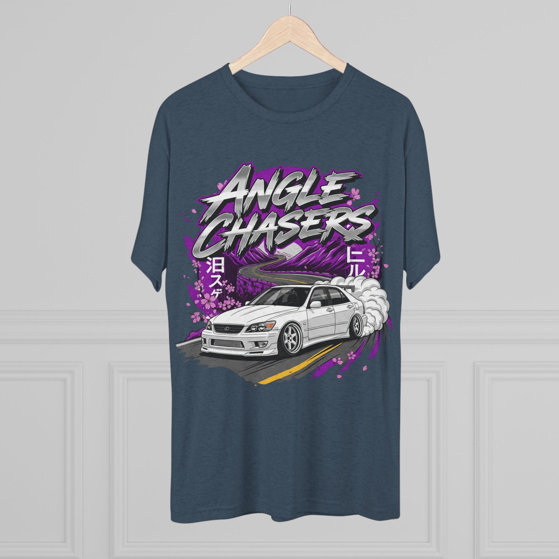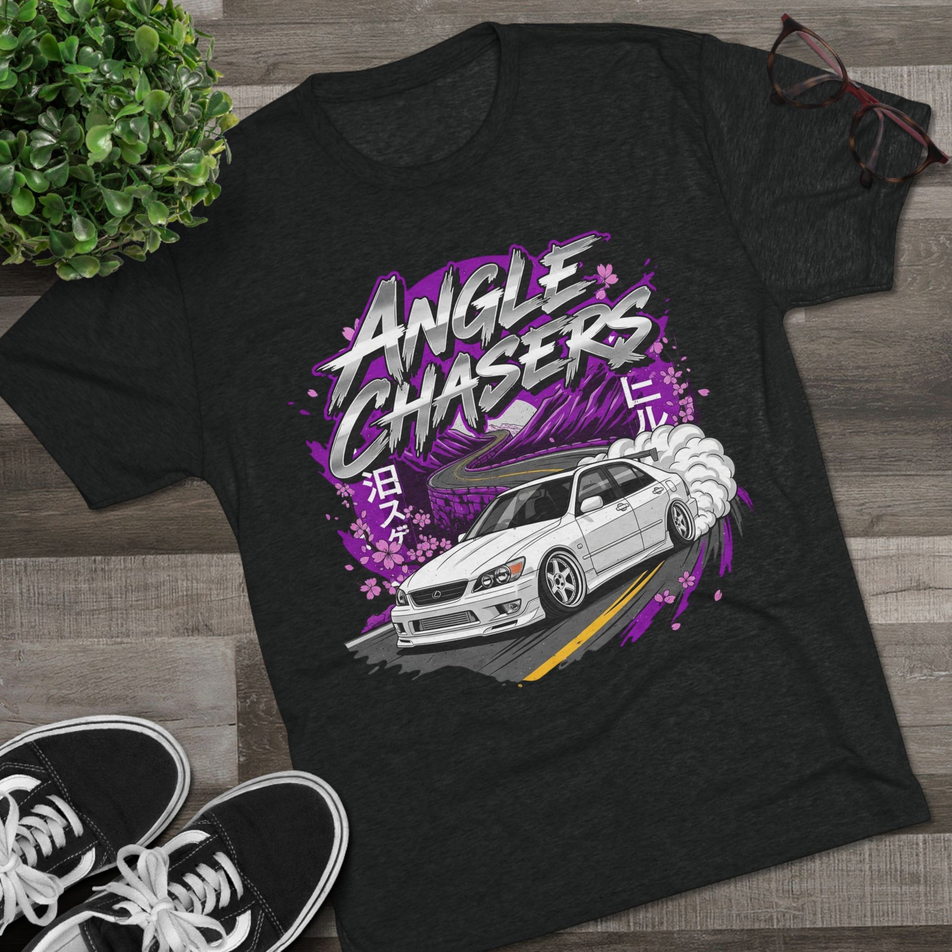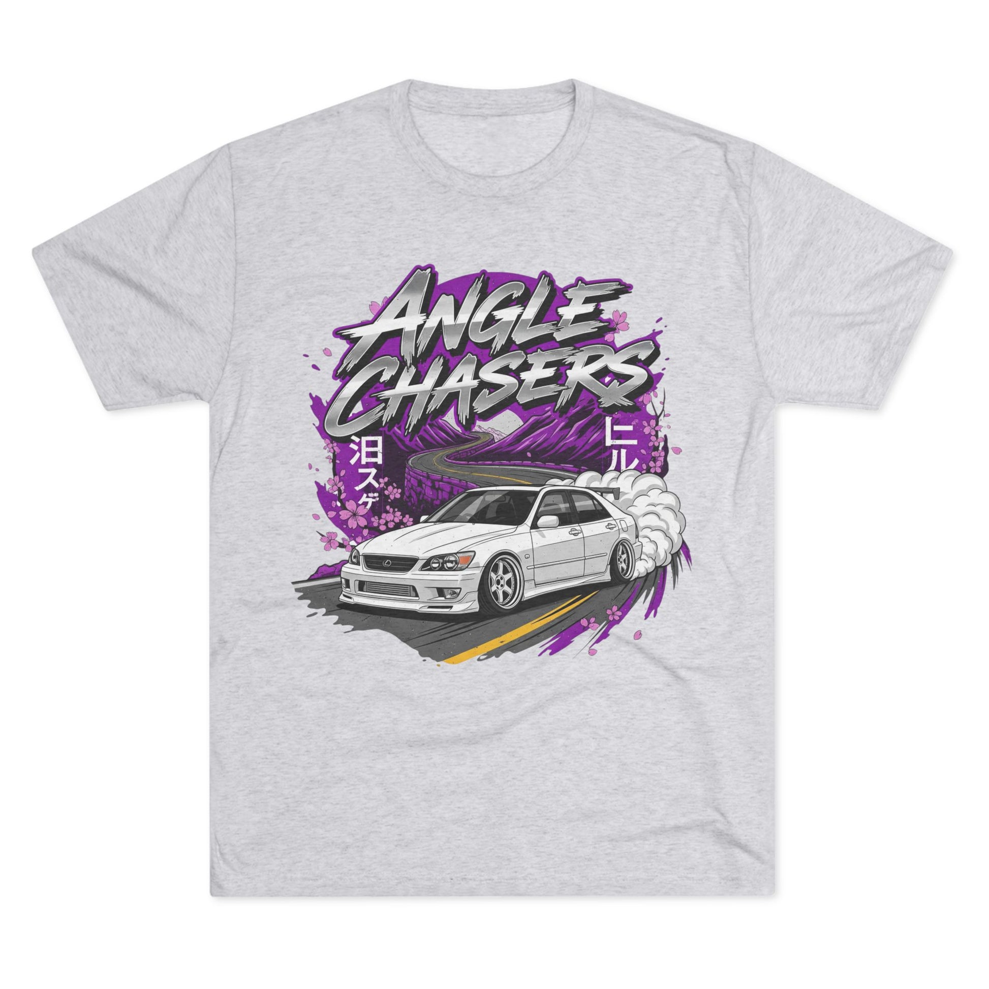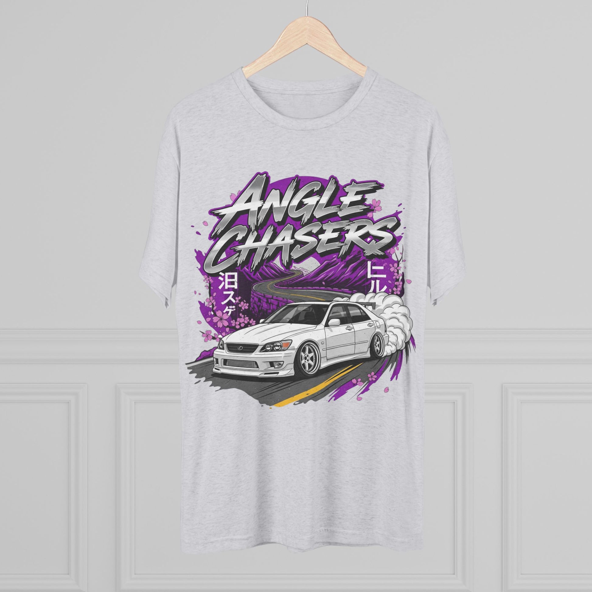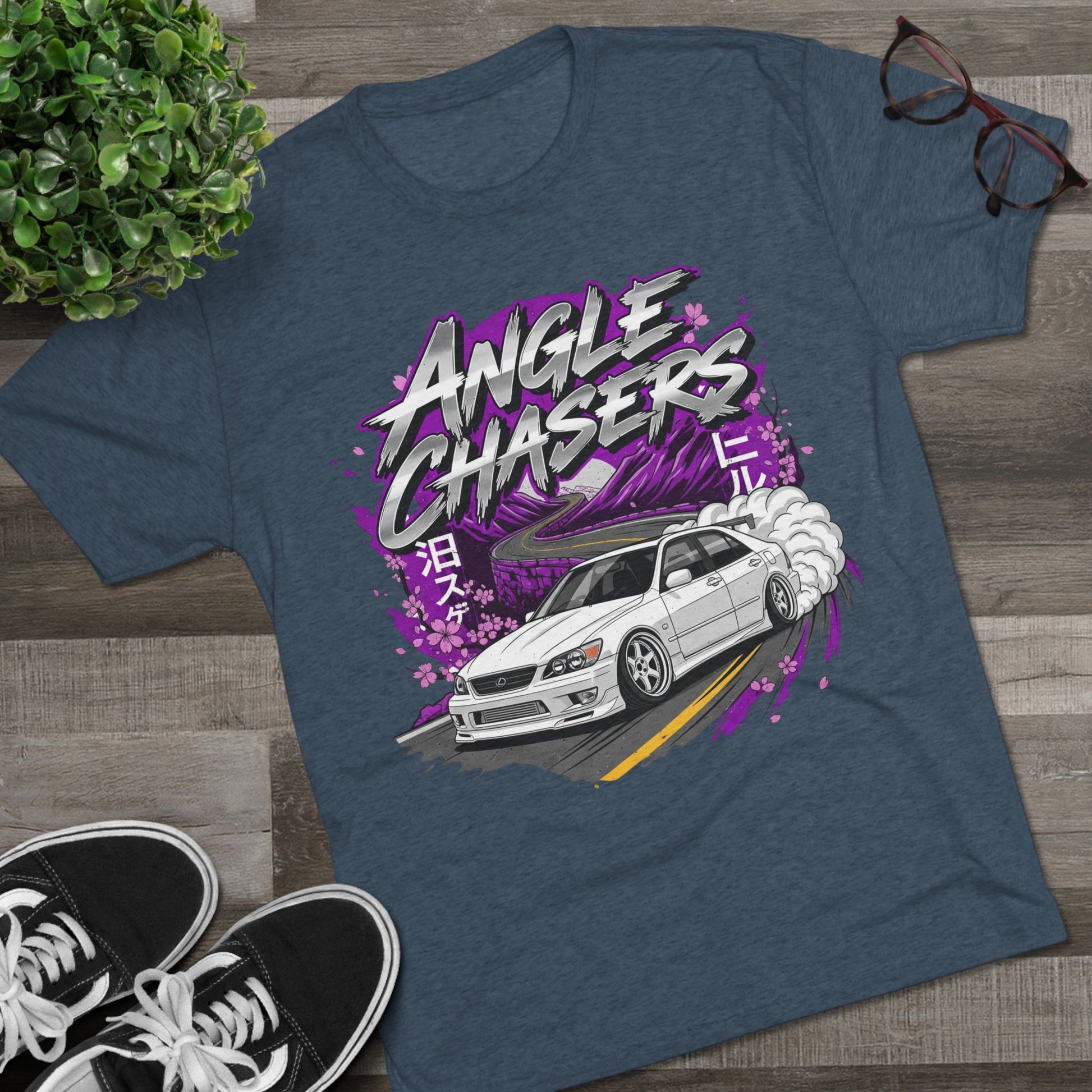 A soft and durable tri-blend crew tee with a stylish IS300 mountain drifting, giving off a cool and casual vibe. Featuring Angle Chasers sponsor logos on the back. Perfect for enthusiasts of drifting and car culture. Ideal for gifting during birthdays, holidays, or car meets.